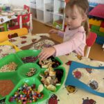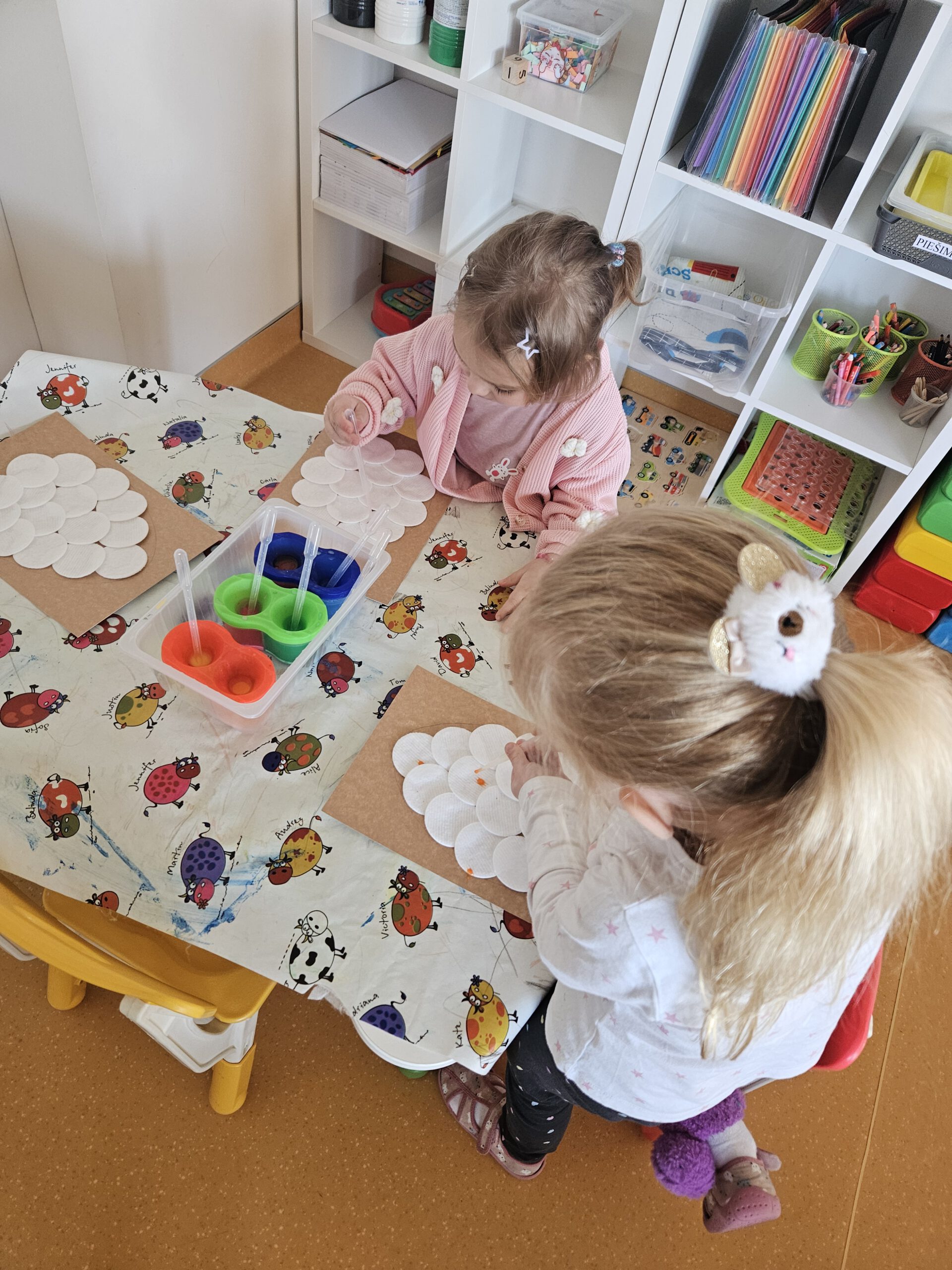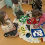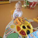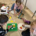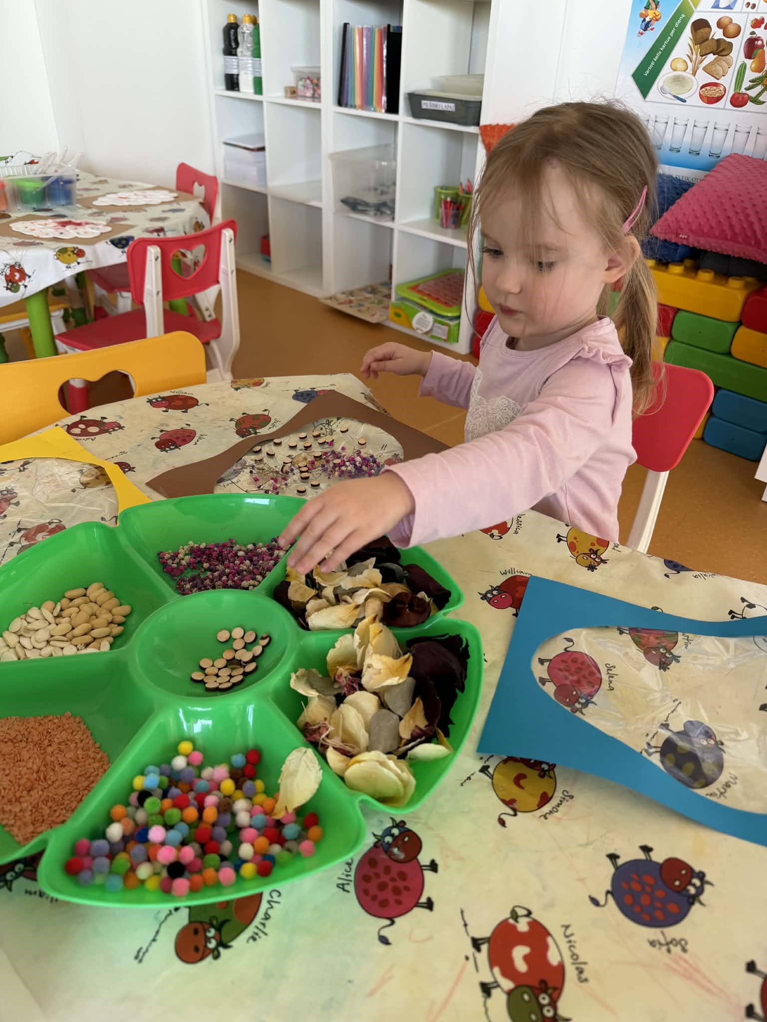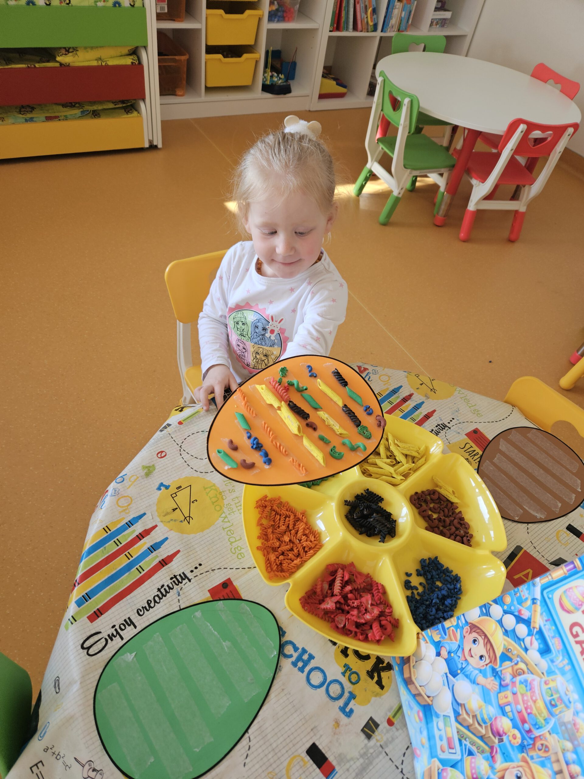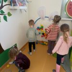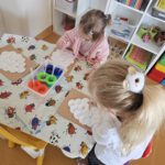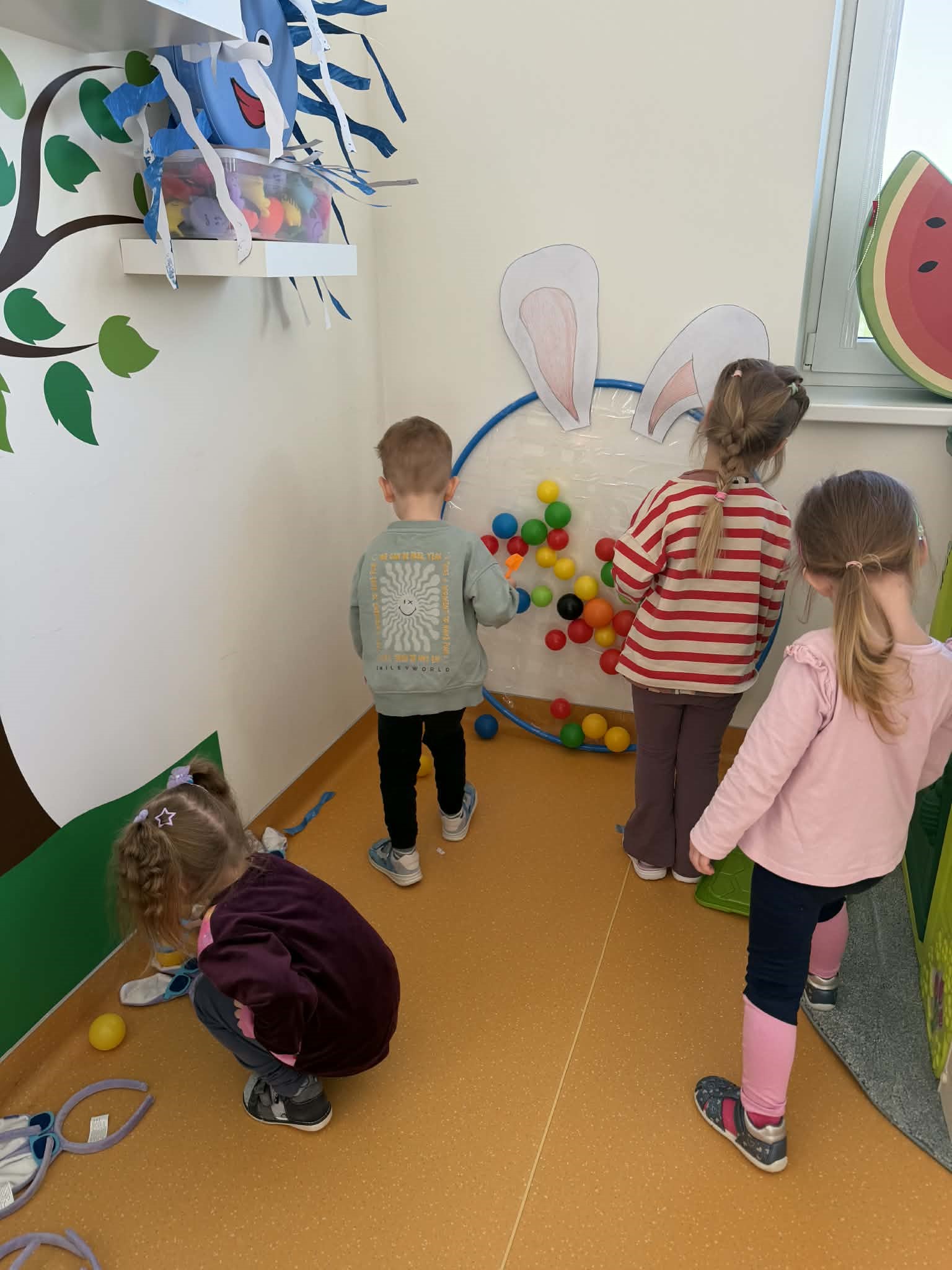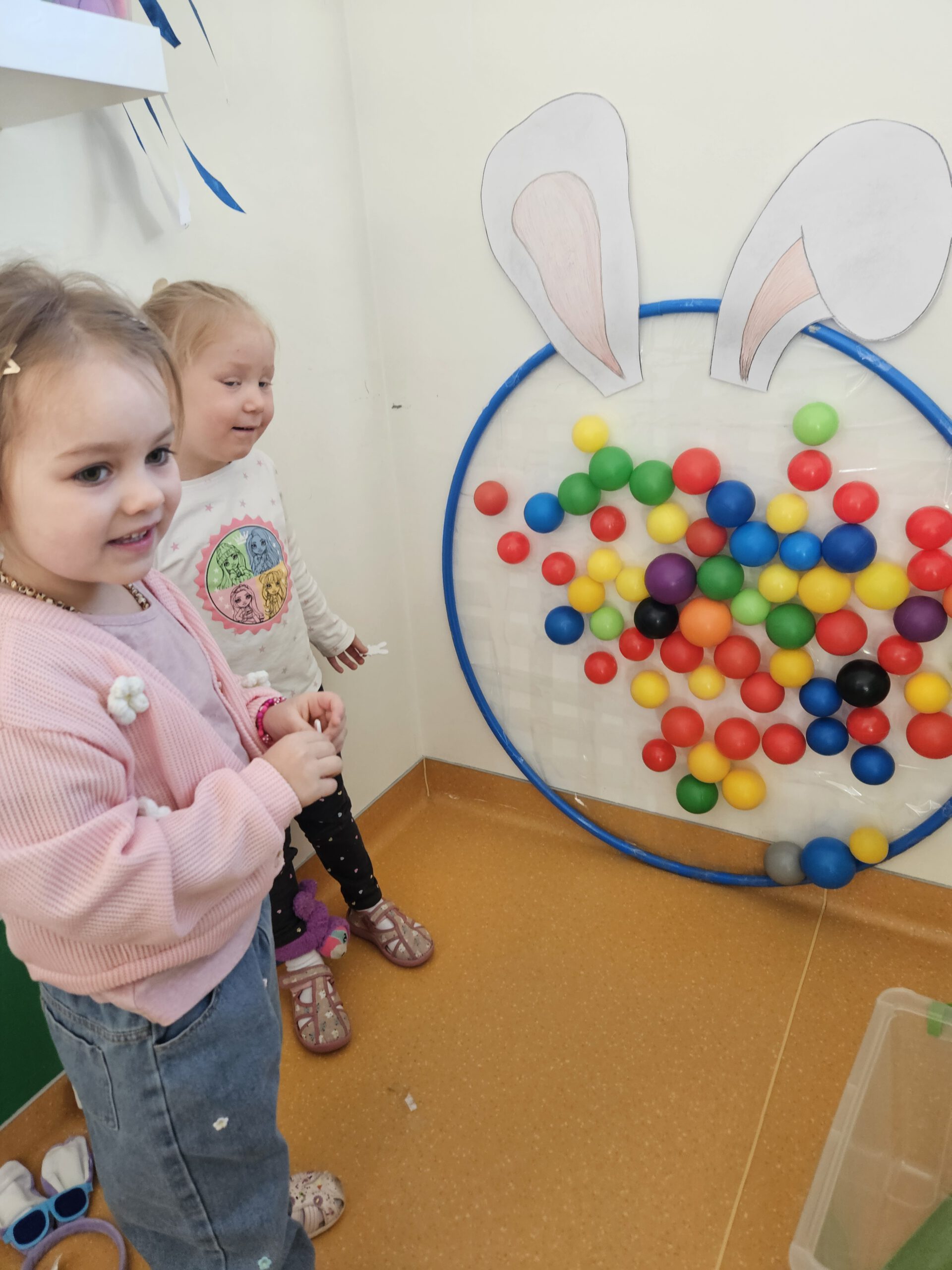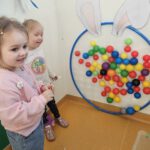Žaidybinės veiklos kontekste buvo kuriama situacija su kiškučiu, kurio „pilvelis“ buvo tuščias. Ugdytiniai jį pildė spalvotais kamuoliukais, taip padėdami kiškučiui „susigrąžinti“ margučius. Ši veikla skatino įsitraukimą, dėmesio koncentraciją, smulkiosios motorikos lavėjimą ir teigiamas emocijas.