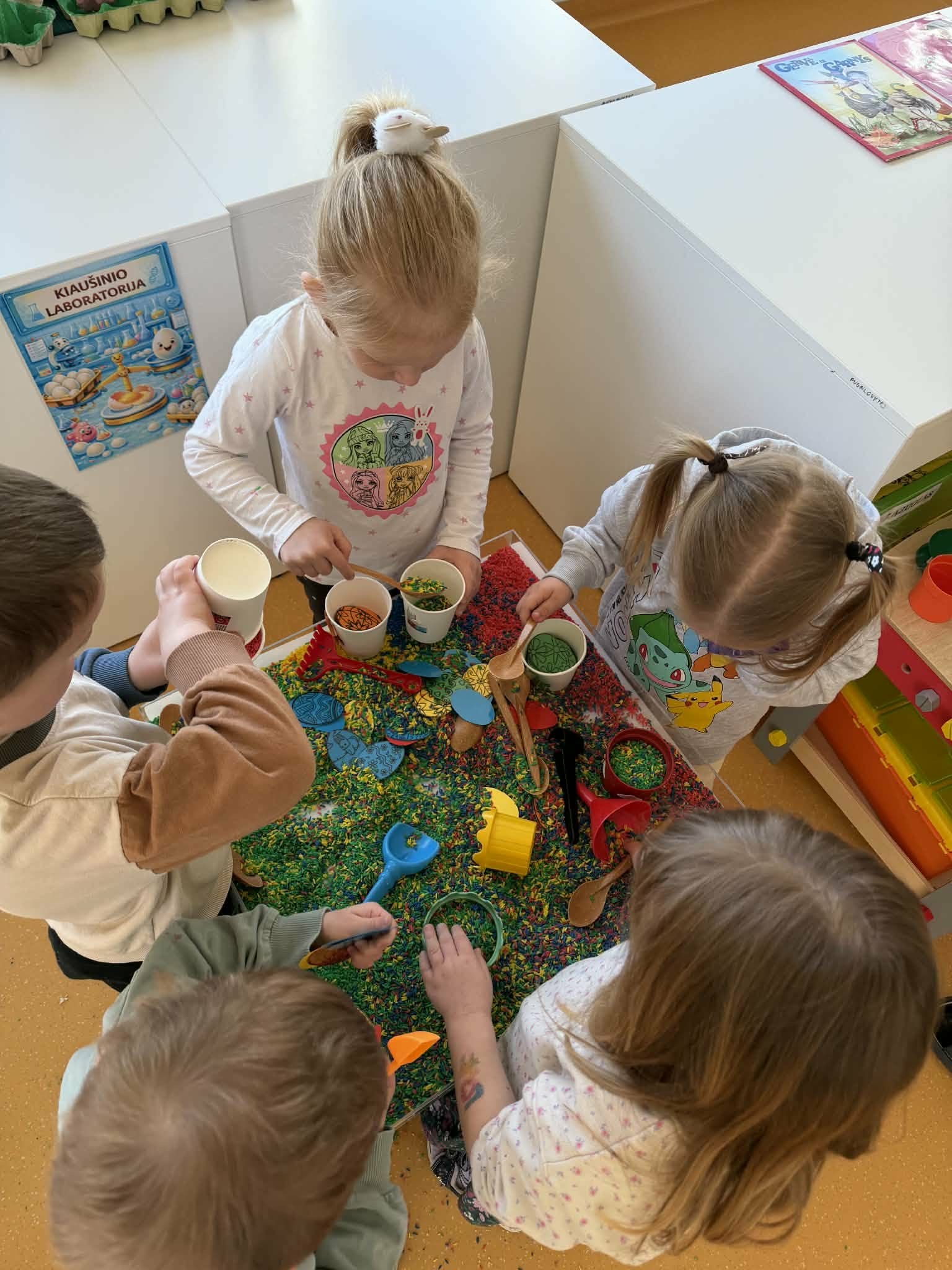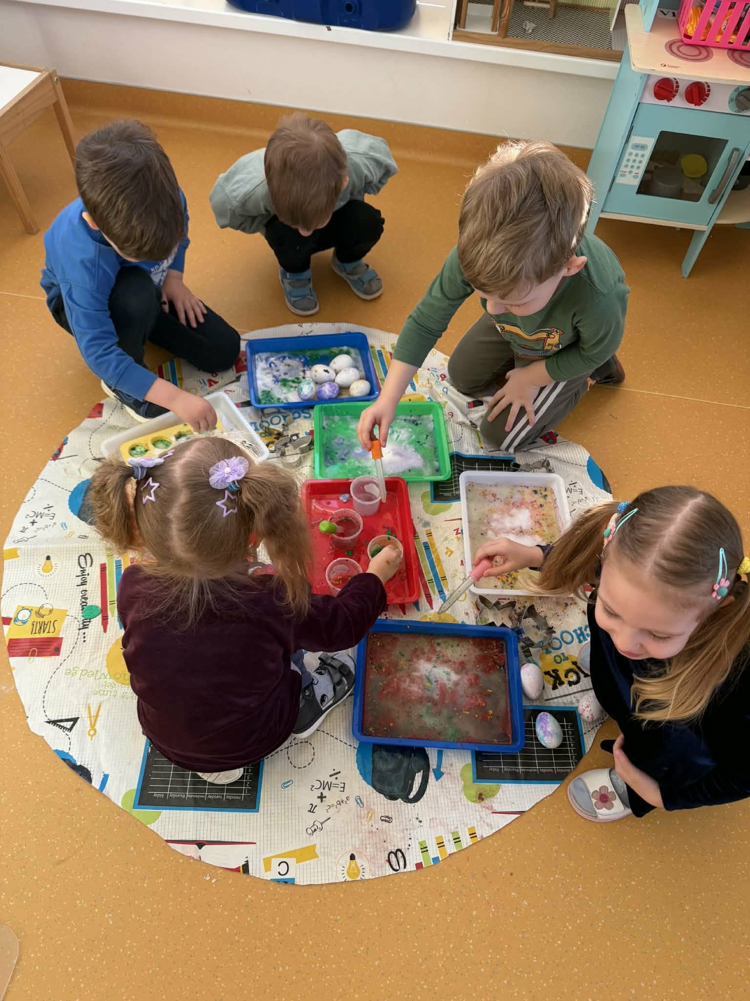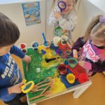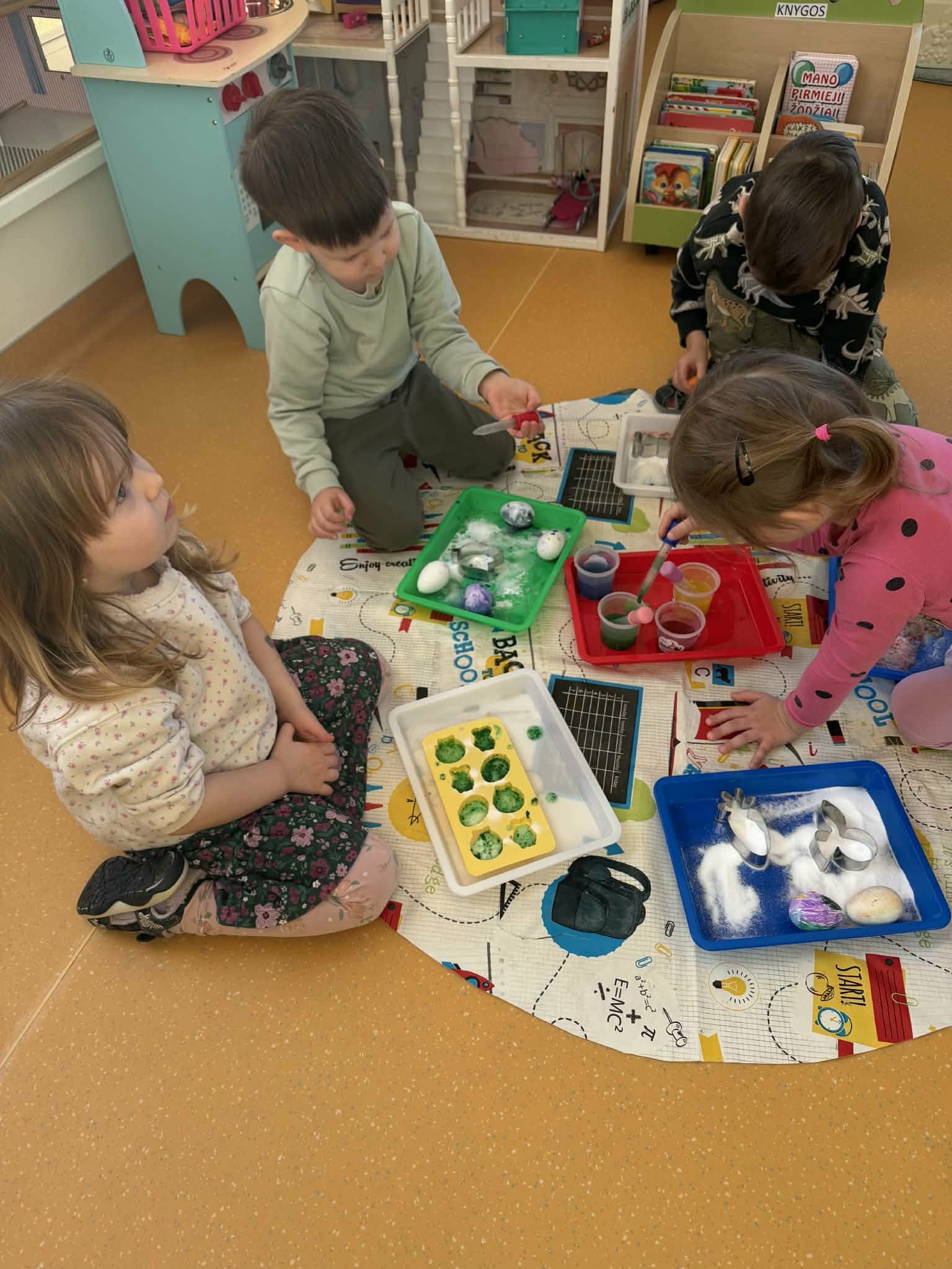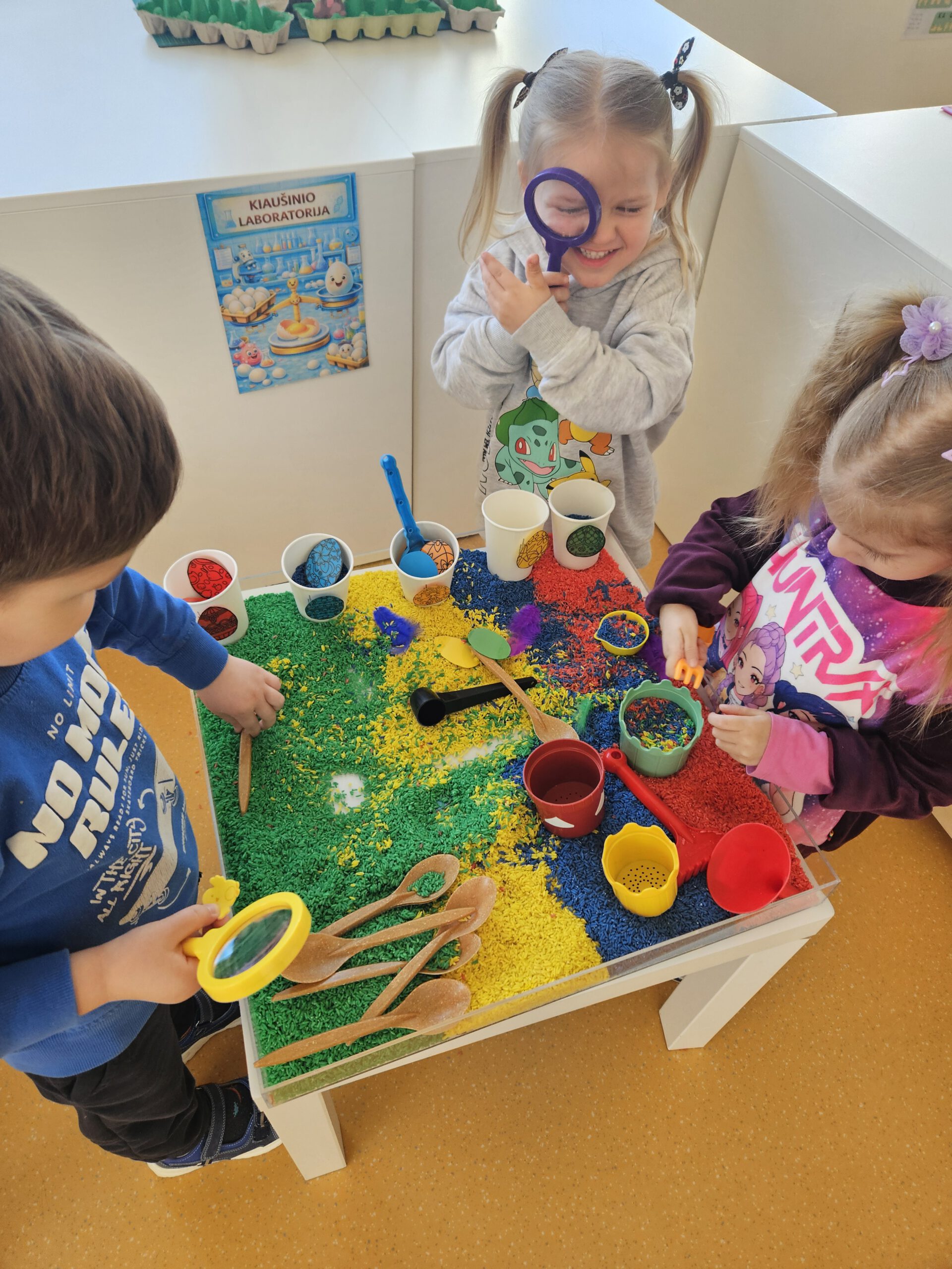 Tyrinėjimo ir gilaus mokymosi kontekste ugdytiniai ieškojo paslėptų kiaušinių, juos apžiūrėjo, lietė, stebėjo per didinamąjį stiklą, lygino dydį ir spalvą. Šios veiklos skatino pažintinius gebėjimus, tyrinėjimą, pastebėjimų formulavimą bei aplinkos pažinimą.