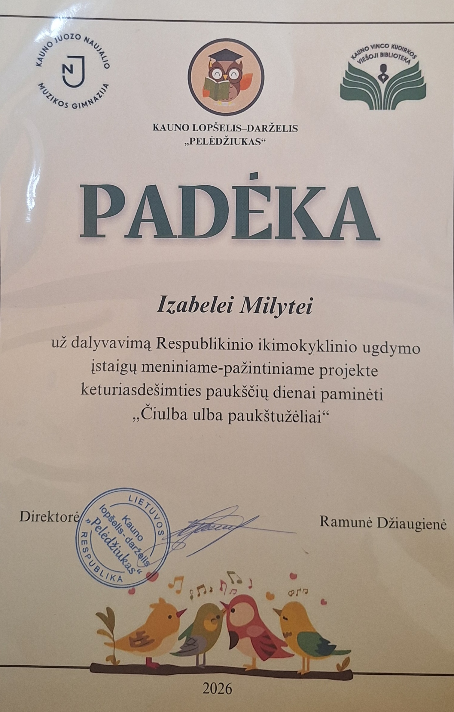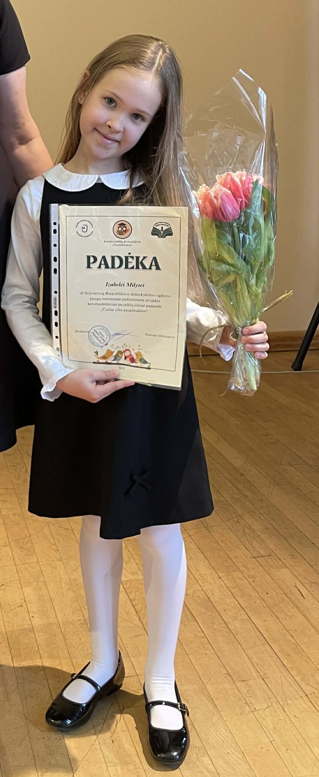 Nuoširdžiai džiaugiamės ir dėkojame Izabelės tėveliams už pagalbą bei rūpestį, kad prisidėjo prie sklandaus dalyvavimo šiame gražiame renginyje. Taip pat nuoširdžiai dėkojame įstaigos administracijai ir visai bendruomenei už palaikymą, paskatinimą ir tikėjimą jaunaisiais talentais.